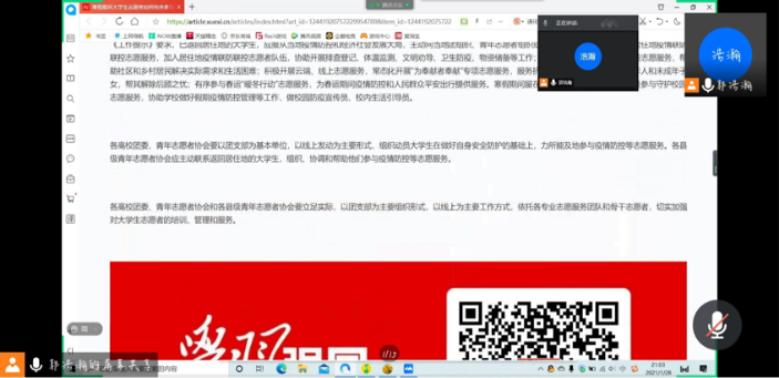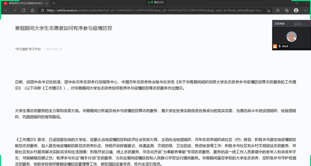 首先,班长及团支书带领全班同学一起学习了消防小常识——灭火“十招”,让大家了解火灾的危害、也学习了如何处理一些宿舍和生活中的消防问题。其次带领大家学习有关“寒假期间大学生志愿者如何有序参加疫情防控”的文件,宣传大学生在志愿服务中应承担起的责任与义务,号召大学生积极参加志愿活动,在融入社会的同时贡献自己的一份力量;最后,班长提醒同学们不能因寒假就懈怠自己的学习,即使不在学校也要注重培养自己的能力,提高个人素养,广泛汲取专业知识以及社会中的各类知识以丰富自己。