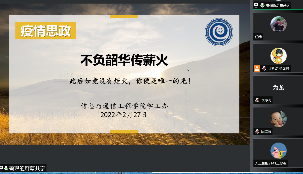 本网讯(通讯员 鲁琪)疫情当前,为做好学生思想政治教育工作,教育引导广大青年学生在疫情期间增强自我管理、自我服务、自我学习的能力,遵守、配合防疫管理规定,争做经院的守护者。新2会员管理端官网于2022年2月27日采取线上晚讲评的方式开展以“不负韶华传薪火”为主题的疫情思政课,以“中国的温暖与美好”、“青年人的责任与担当”、“致敬战役中的平凡英雄”为分篇分别教育引导学生,提升学生思想认识,争做有为新青年。
